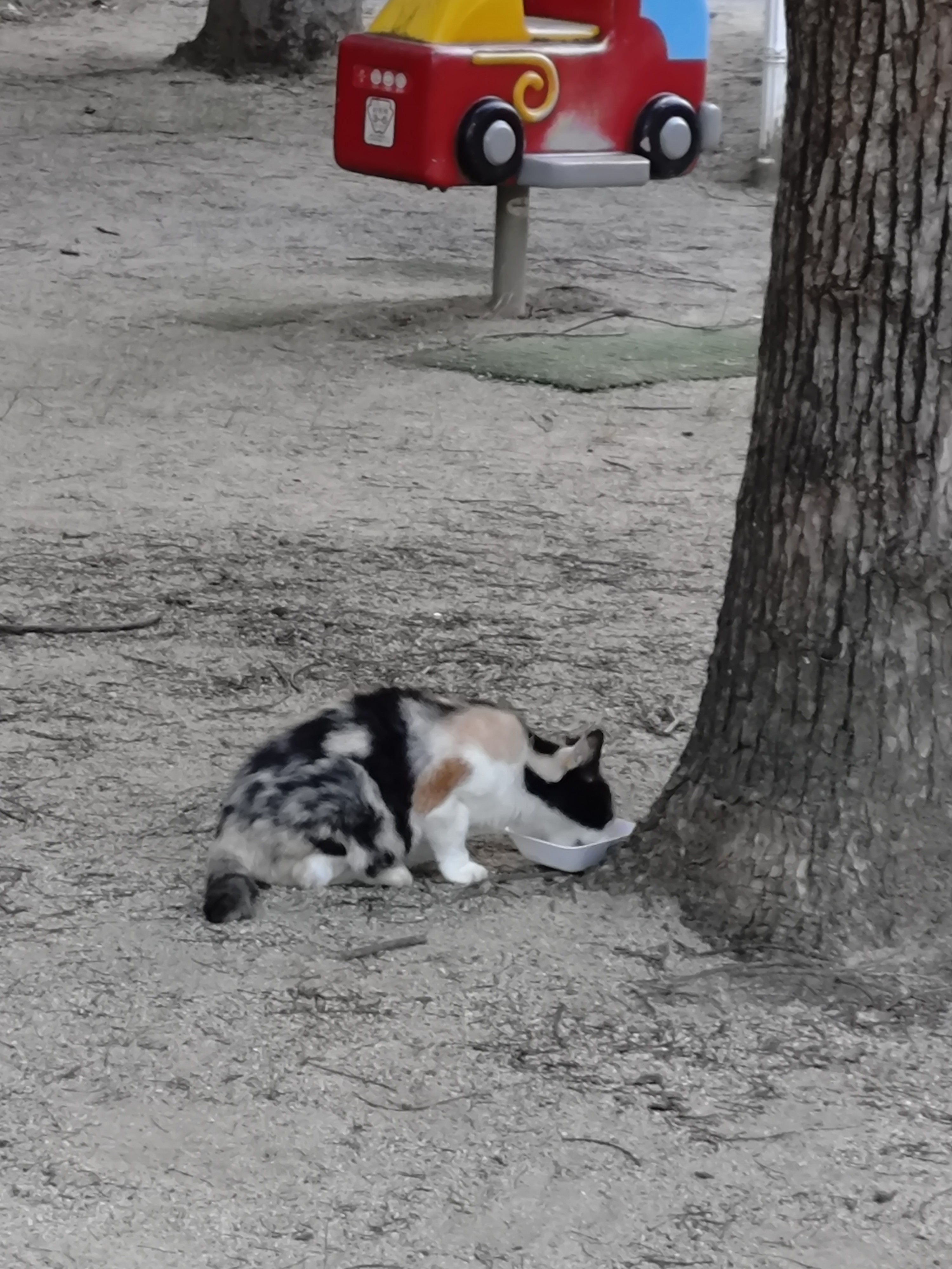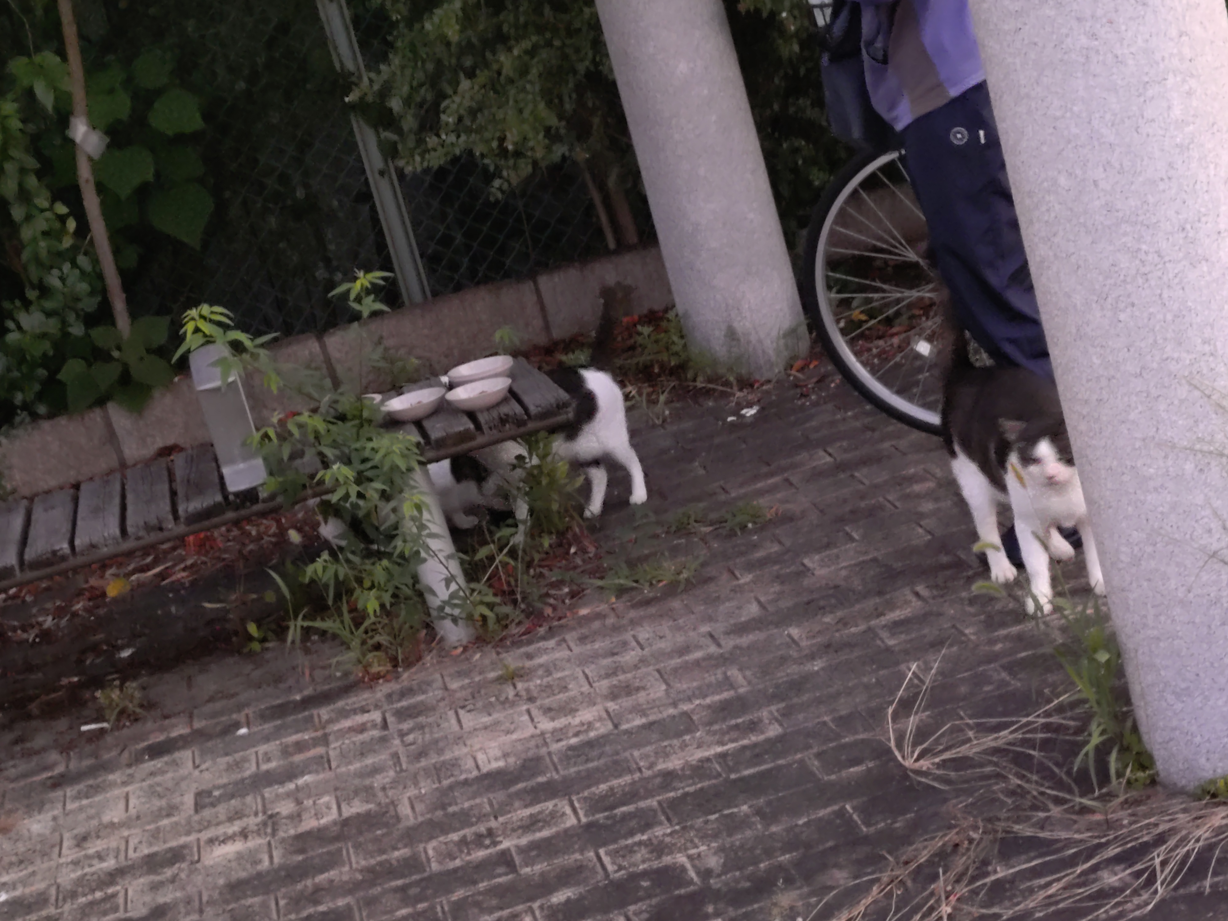 帰りにそのお皿を回収してる。蓬川沿いの猫は数か所にもいてるから、その日に出てきた猫たちに