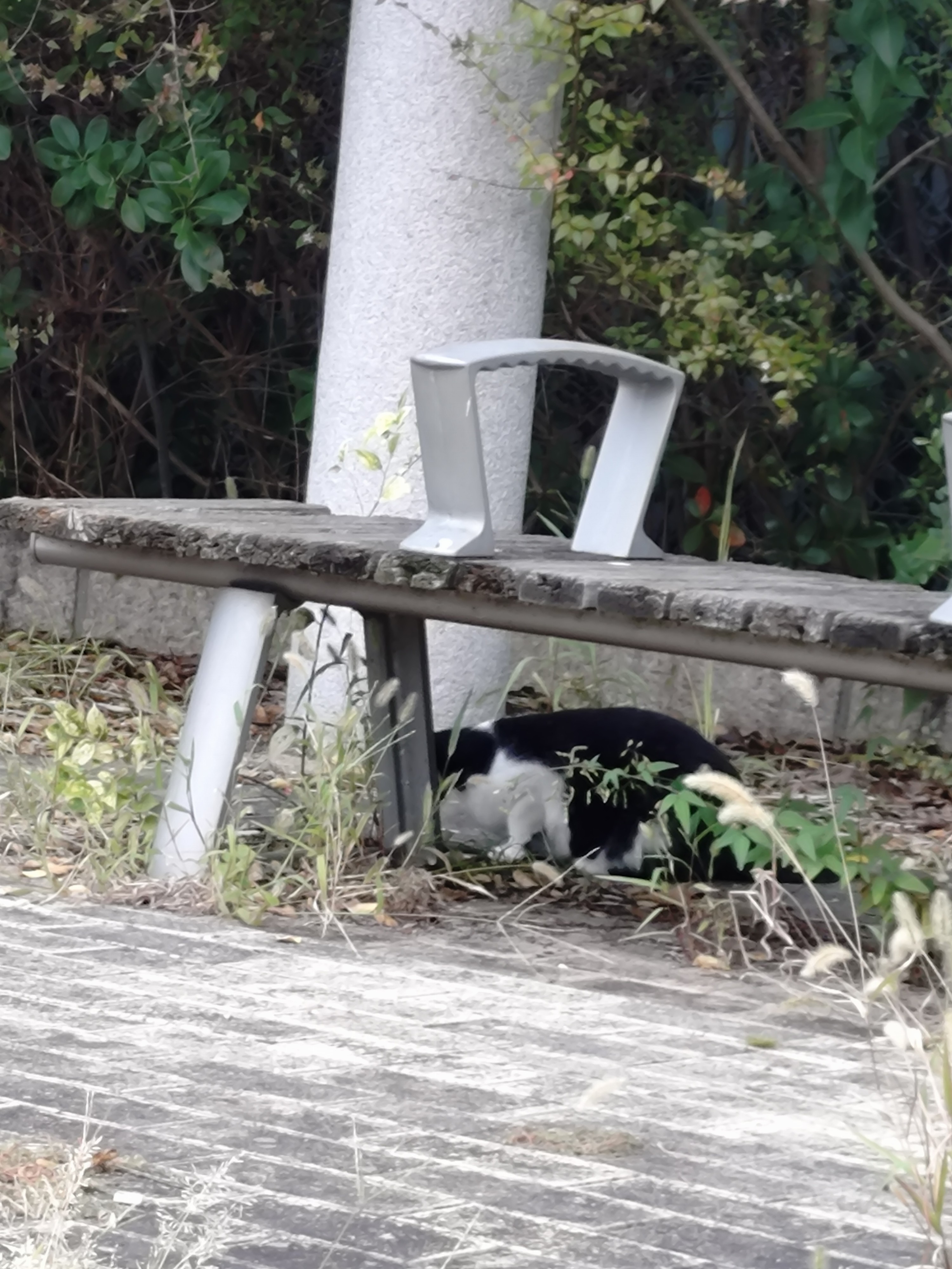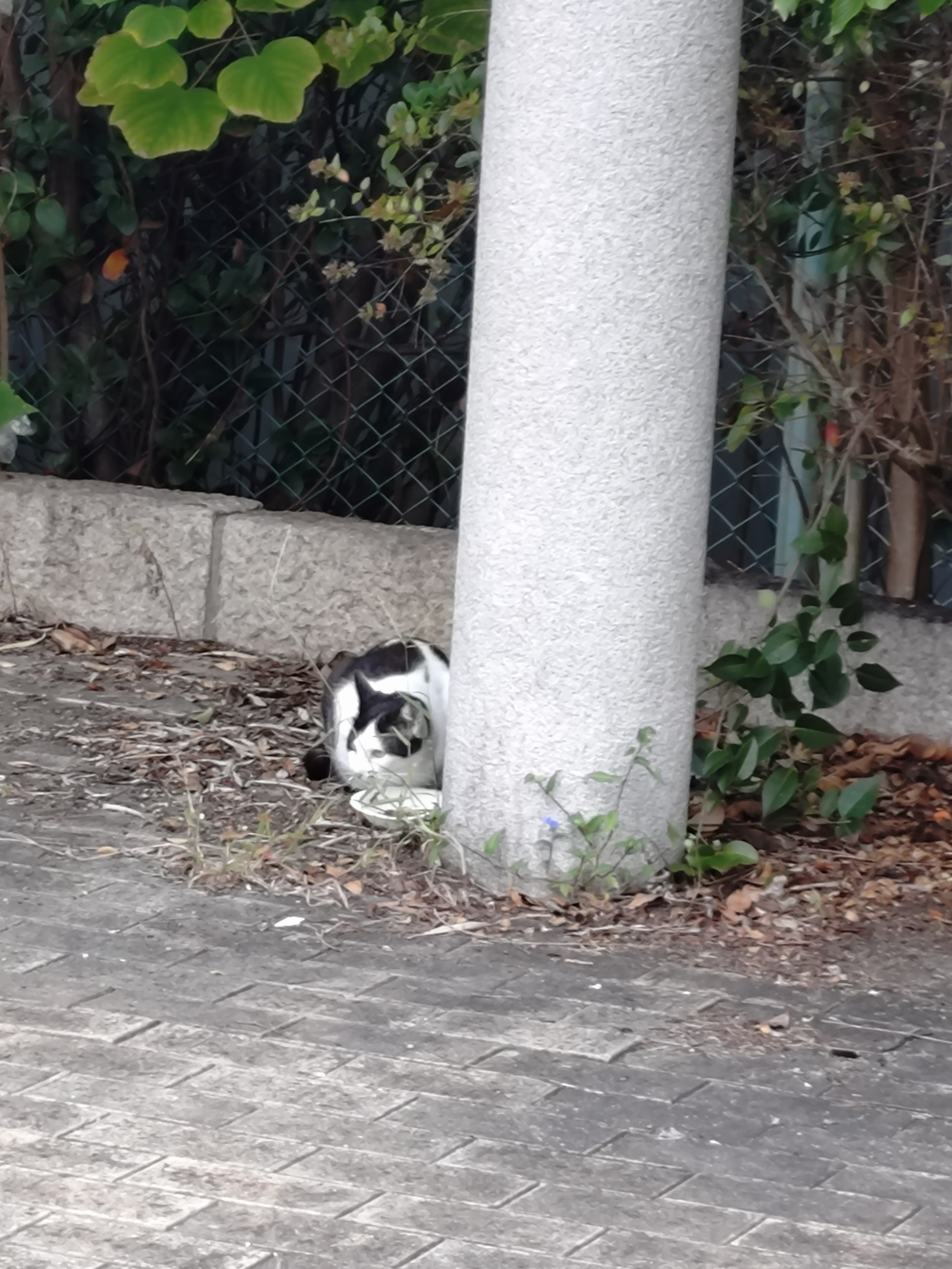 今日ね、蓬川沿いの臨港線から南の所にいた白黒猫たちを見かけたので、餌をやりに行ってん。