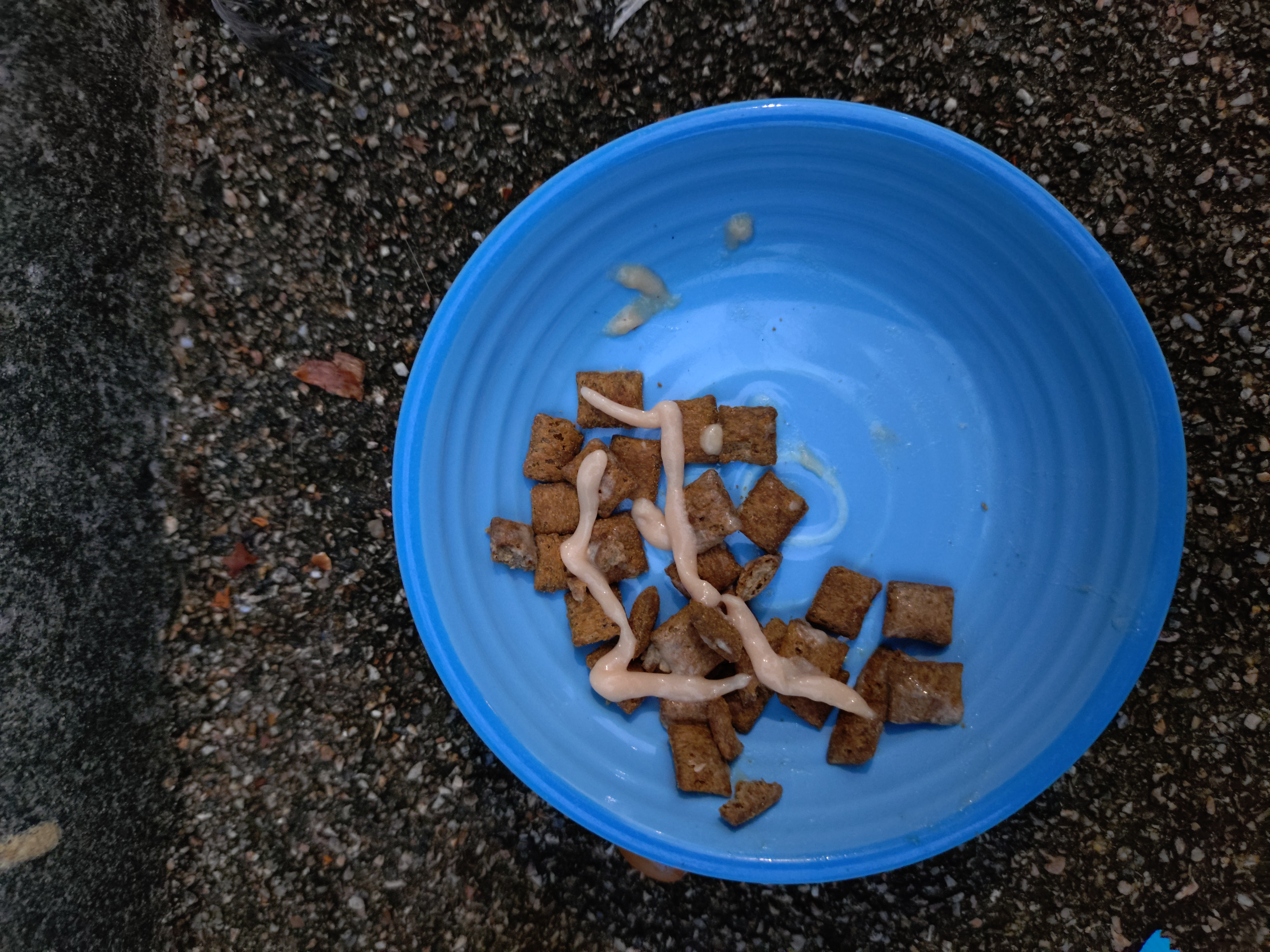 ニャーニャー鳴いて・・毎朝待ってる「シロ」です。シーバの上にチュールをかけないと食べません。