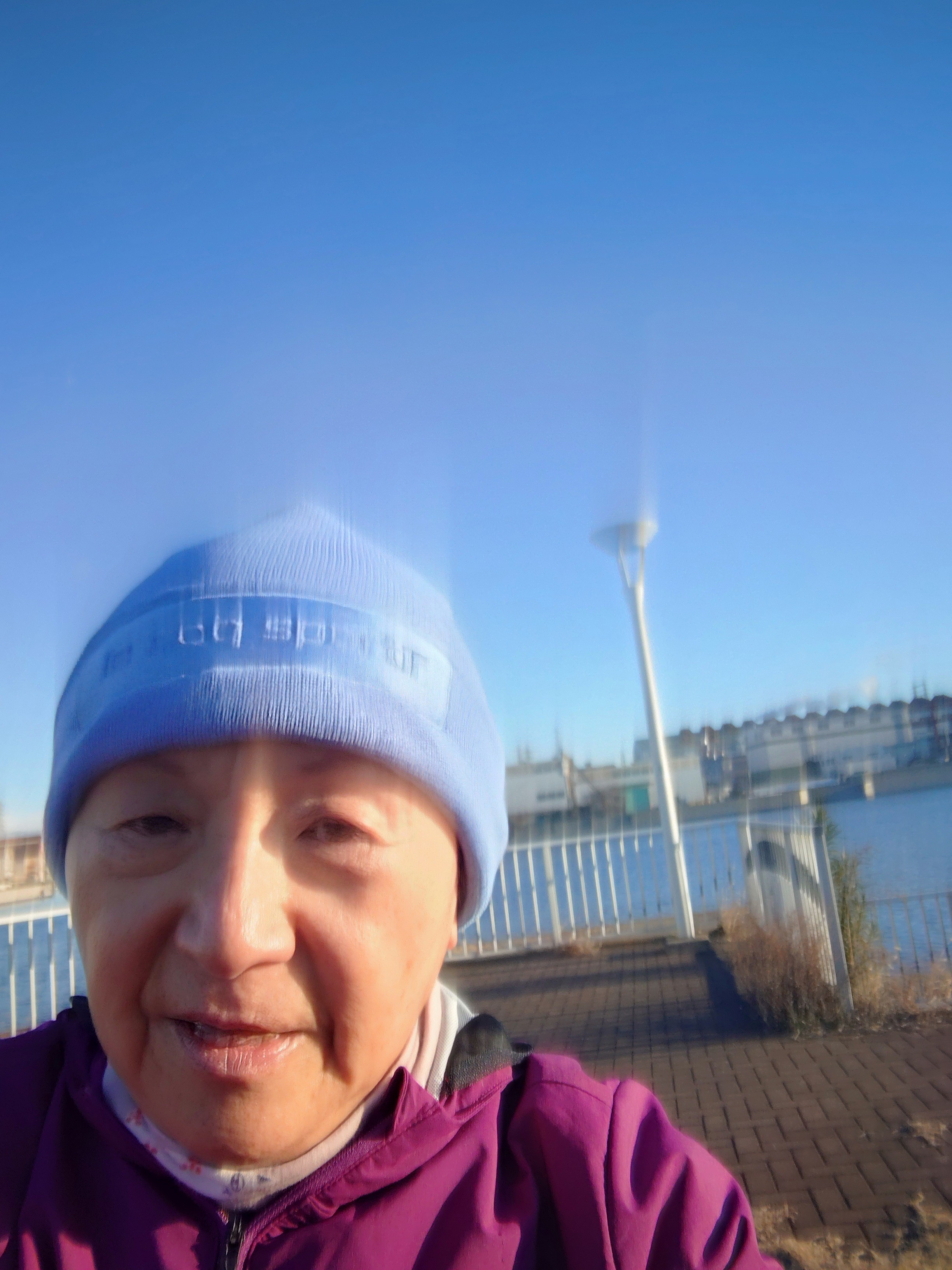 イヤーウォーマーから、毛糸の帽子に変えて、足にはレッグウォーマーをして走ってる。