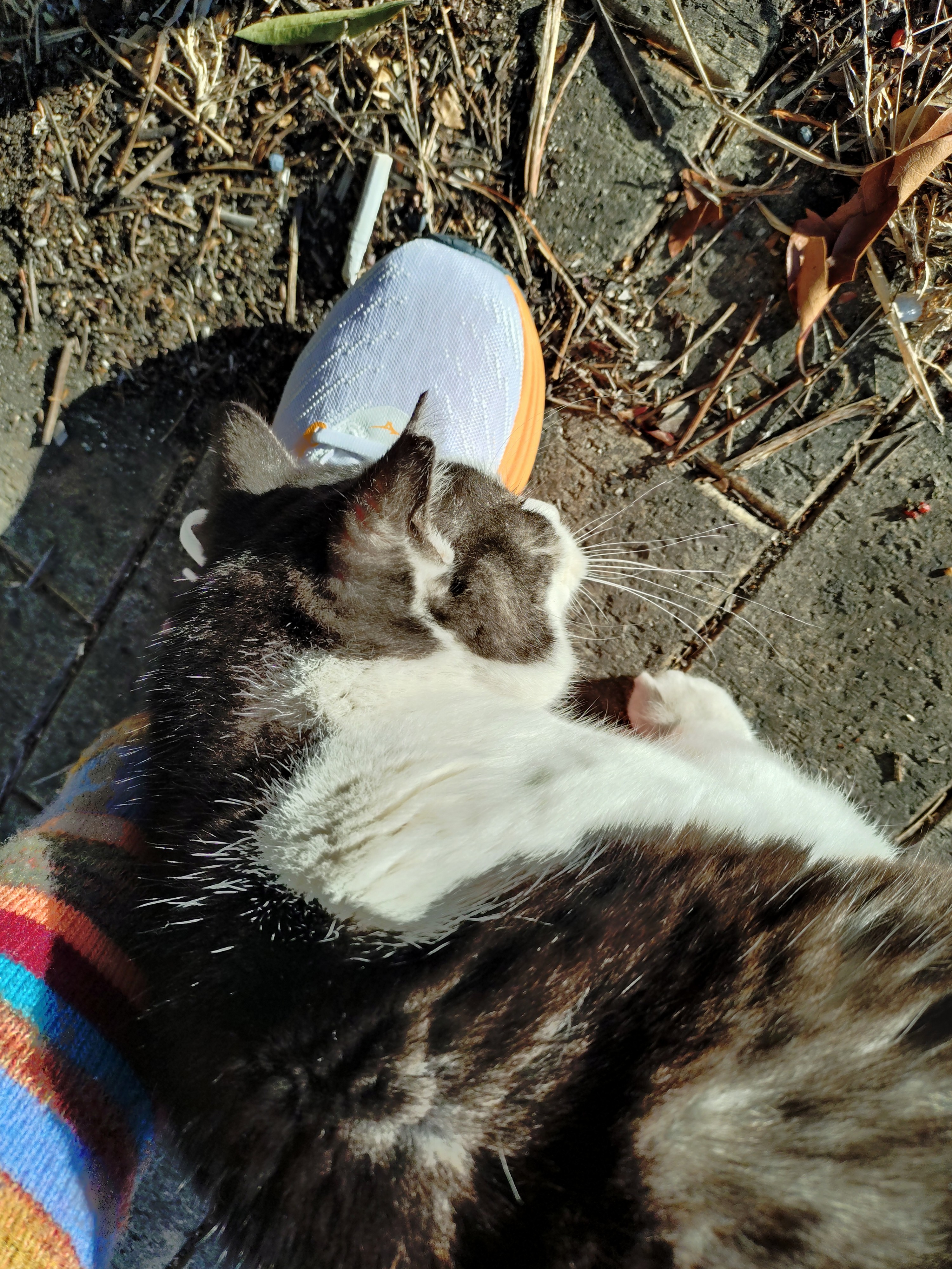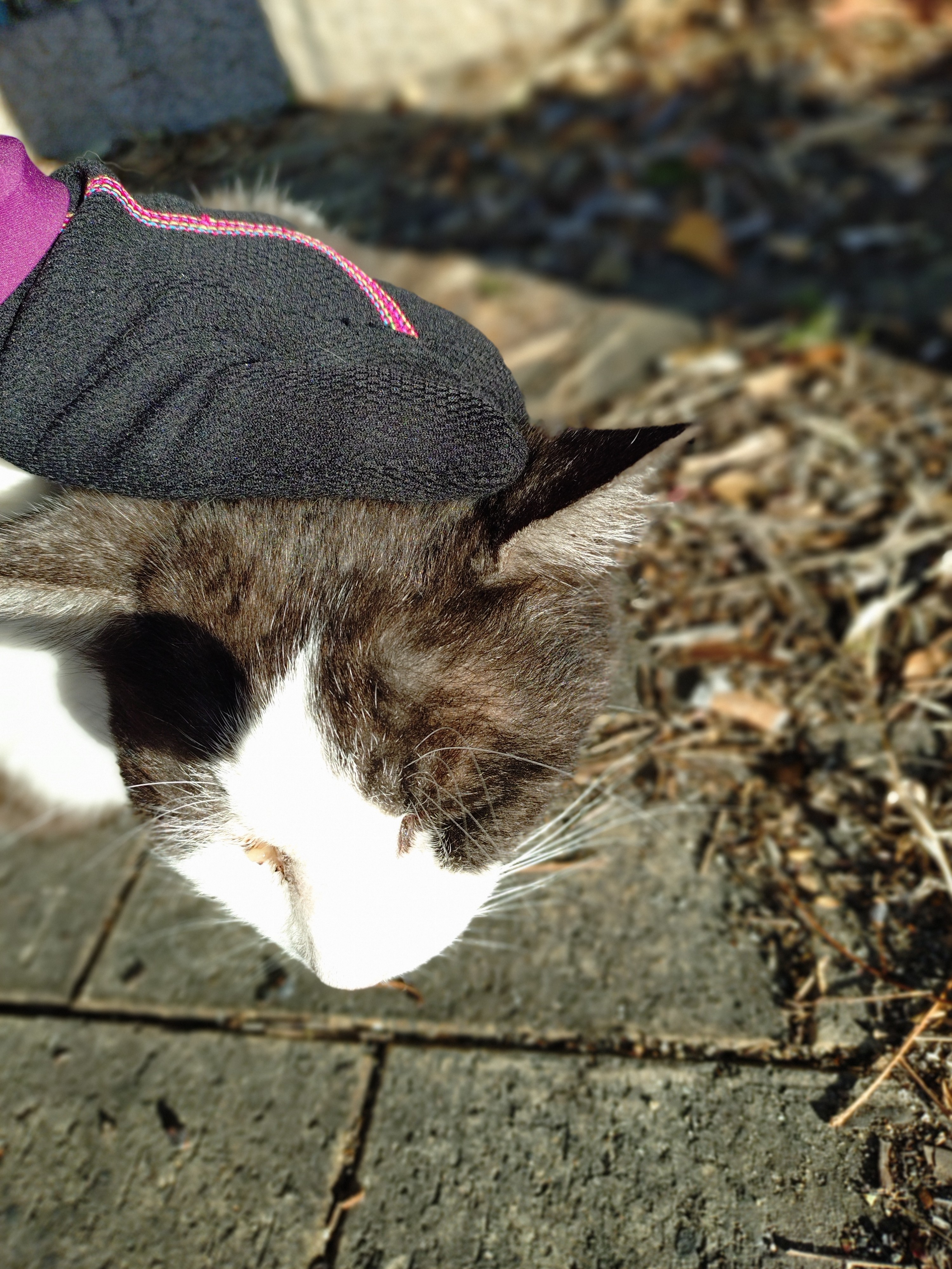 蓬川沿いの第2の部落に住んでる白黒猫。‥なかなか懐いてこなかったのが、この前、足元に寄って来た。