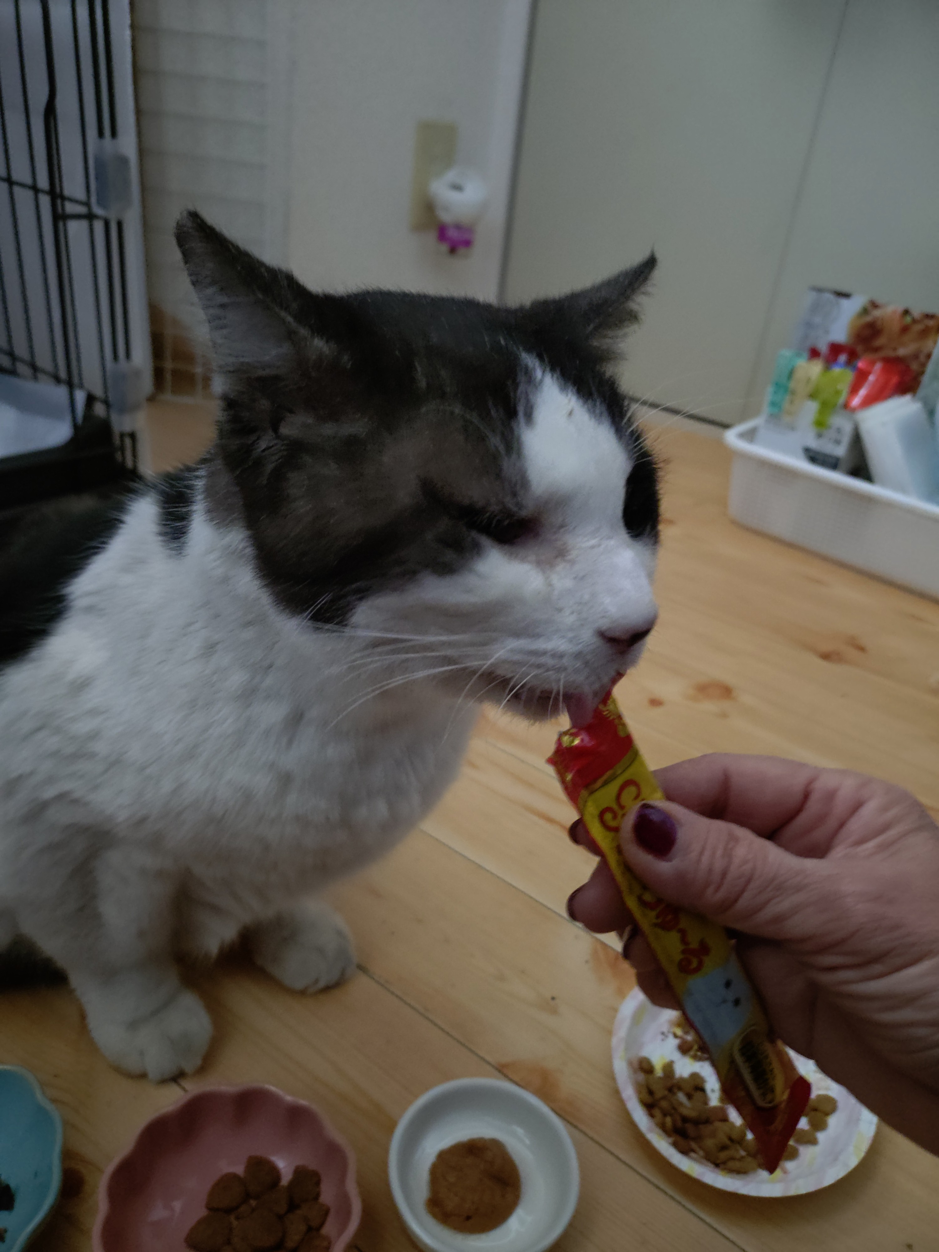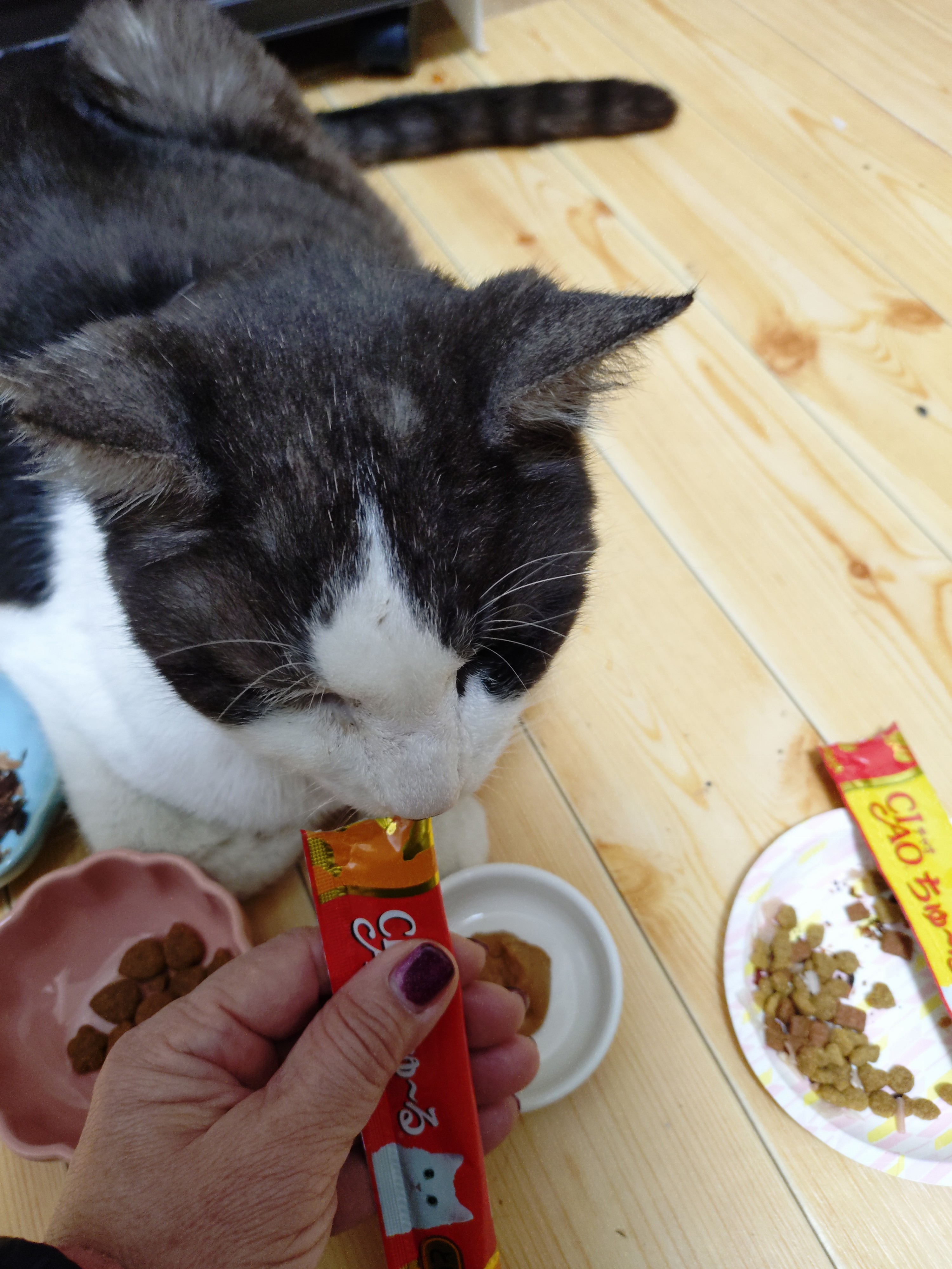 で、持って行ったチュールをやったら・・・食べたよ😊 食べたよ😊 1本と半分は食べました。