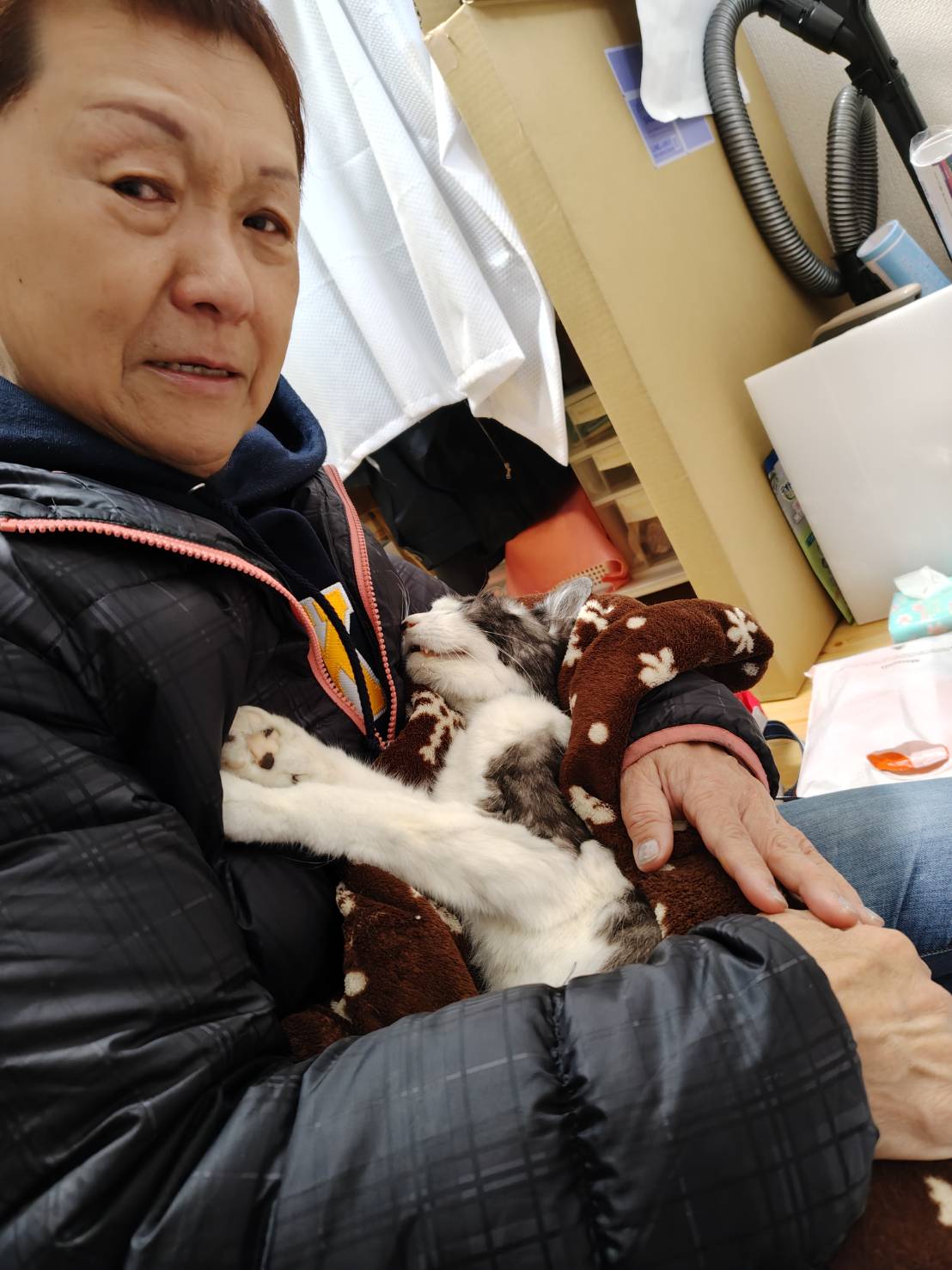 けどね・・ここでも、、白黒🐈はゲージから出てきてエーコの腕の中に入って来てん(@_@;)