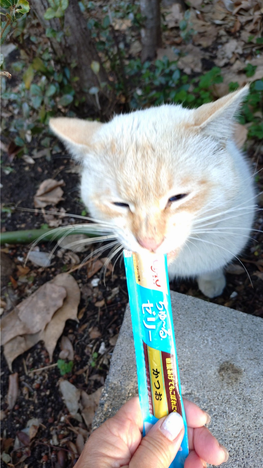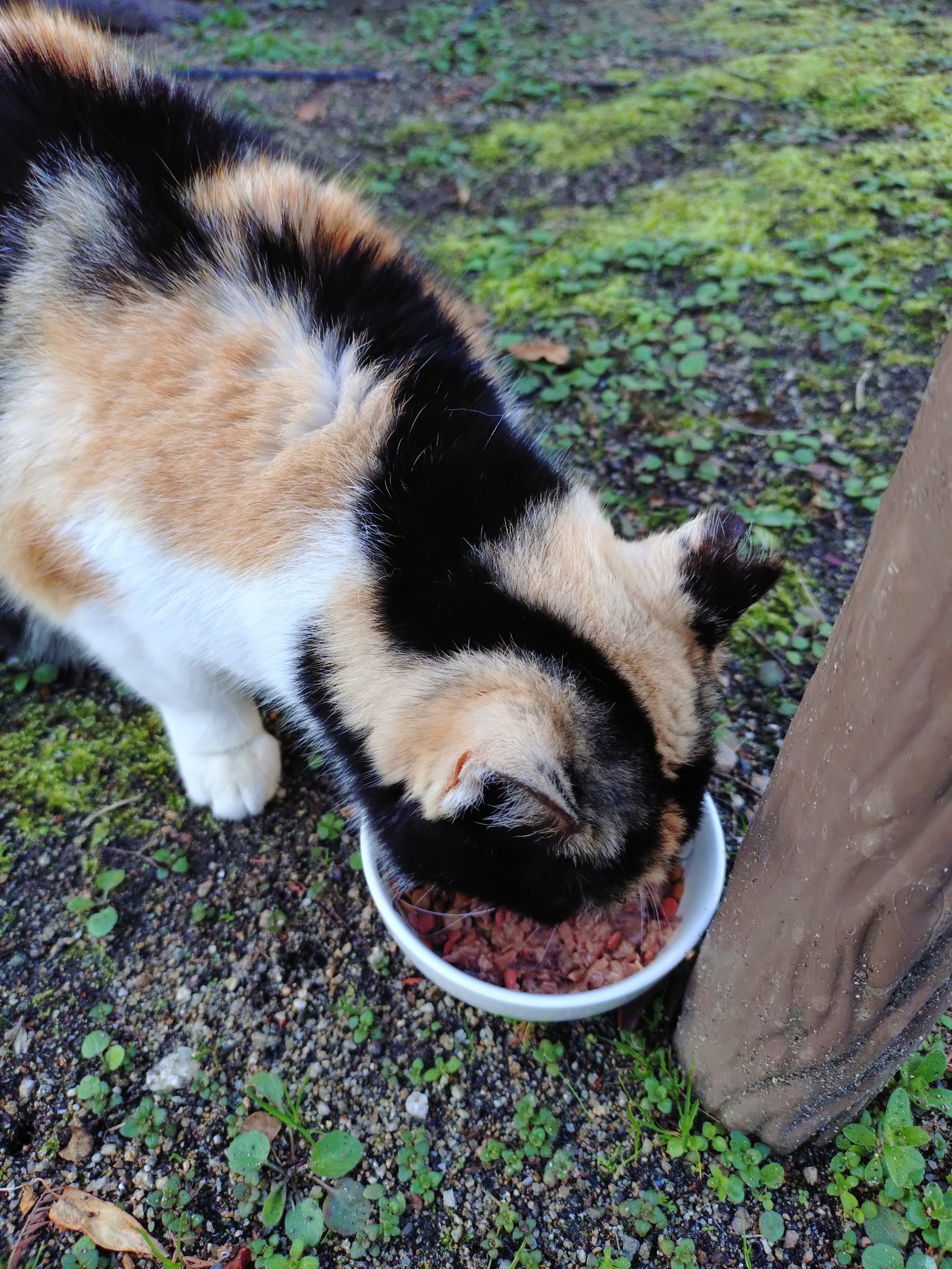 可愛く「ニャ~」と鳴いて、パクパク食べ始める。この猫は1匹で行動をしてるようで、うちの